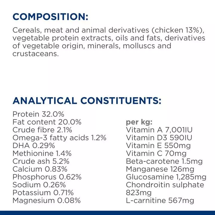 - Protein 32.0%, Fat content 20.0%, Crude fibre 2.1%, Omega-3 fatty acids 1.2%, DHA 0.29%, Methionine 1.4%, Crude ash 5.2%, Calcium 0.83%, Phosphorus 0.62%, Sodium 0.26%, Potassium 0.71%, Magnesium 0.08%; per kg: Vitamin A 7,001IU, Vitamin D3 590IU, Vitamin E 550mg, Vitamin C 70mg, Beta-carotene 1.5mg, Manganese 126mg, Glucosamine 1,285mg, Chondroitin sulphate 823mg, L-Carnitine 567mg.