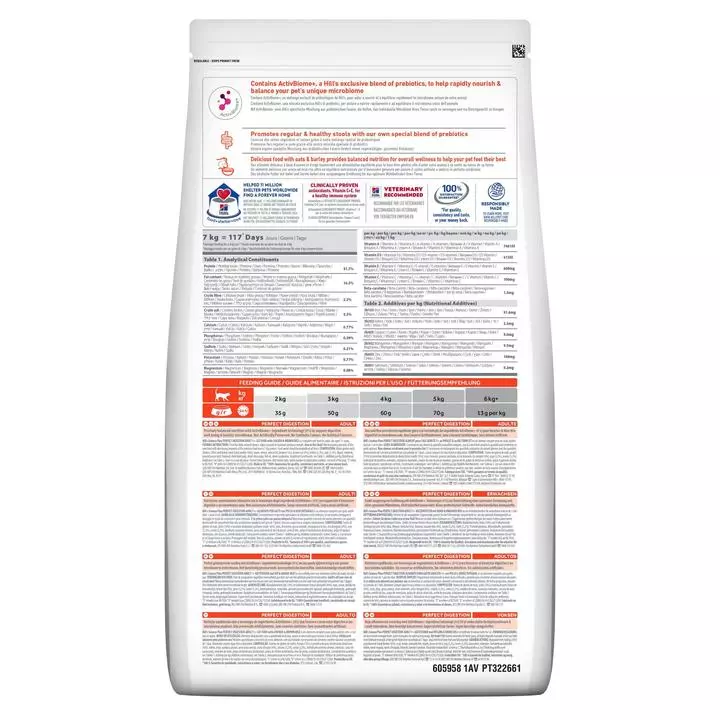 Hill’s Science Plan Perfect Digestion Adult 1+ Cat food contains ActivBiome+, a Hill’s exclusive brand of prebiotics, to help rapidly nourish & balance your pet’s unique microbiome. It promotes regular & healthy stools with our own special blend of prebiotics. It’s a delicious food with oats & barley to provide balanced nutrition for overall wellness to help your pet feel their best.