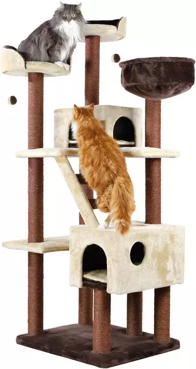 Felicitas scratching post with plush cover. Posts wrapped in natural sisal. Padded base plate and platforms. 2 Caves with reversible cushions. Reversible cushions is hand washable. Padded cuddly bag with toys on string. Scratching, hiding, cuddling, climbing and enjoying. Scratching posts and furniture fulfil many functions and meet all cat needs. Floor measures 70 cm length by 61 cm width. Post diameter 9 cm. Height: 190 cm. Available in beige/brown colour.